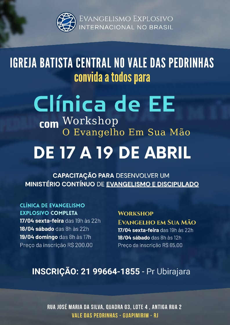 A Clínica de Evangelismo Explosivo capacita a igreja local a viver o evangelismo como estilo de vida, fortalecendo amizades intencionais, promovendo o evangelismo pessoal, estruturando o discipulado com acompanhamento e conduzindo a um crescimento saudável, no qual cada crente é preparado para testemunhar com fidelidade bíblica e compromisso com a Grande Comissão.